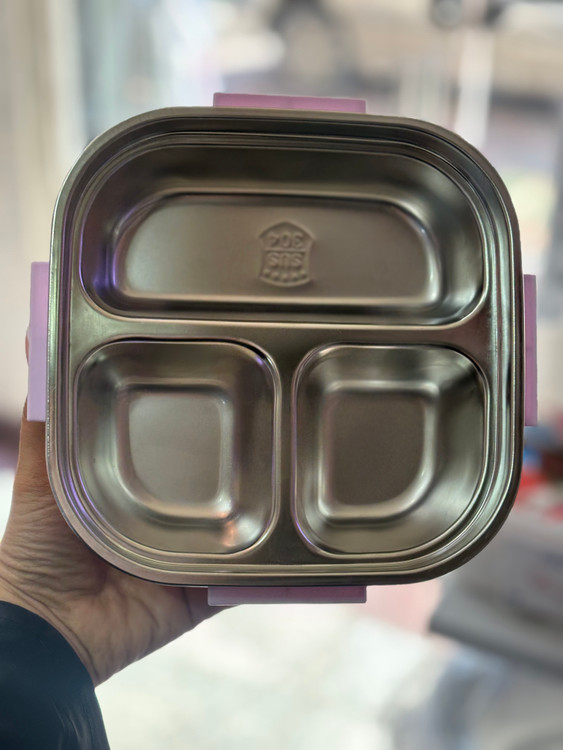 داخل ظرف تقسیم بندی و جنس استیل و به همرا یک قاشق و چنگال بامبو طبق عکس